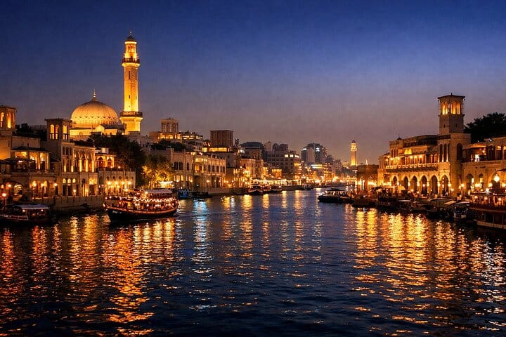 Enjoy a traditional dhow cruise on Dubai Creek with buffet dinner, Tanoura show, and beautiful nighttime heritage views.